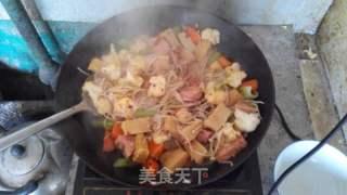 7. 翻炒均匀后,加入适量的宽粉、粉丝或面条,继续翻炒均匀。